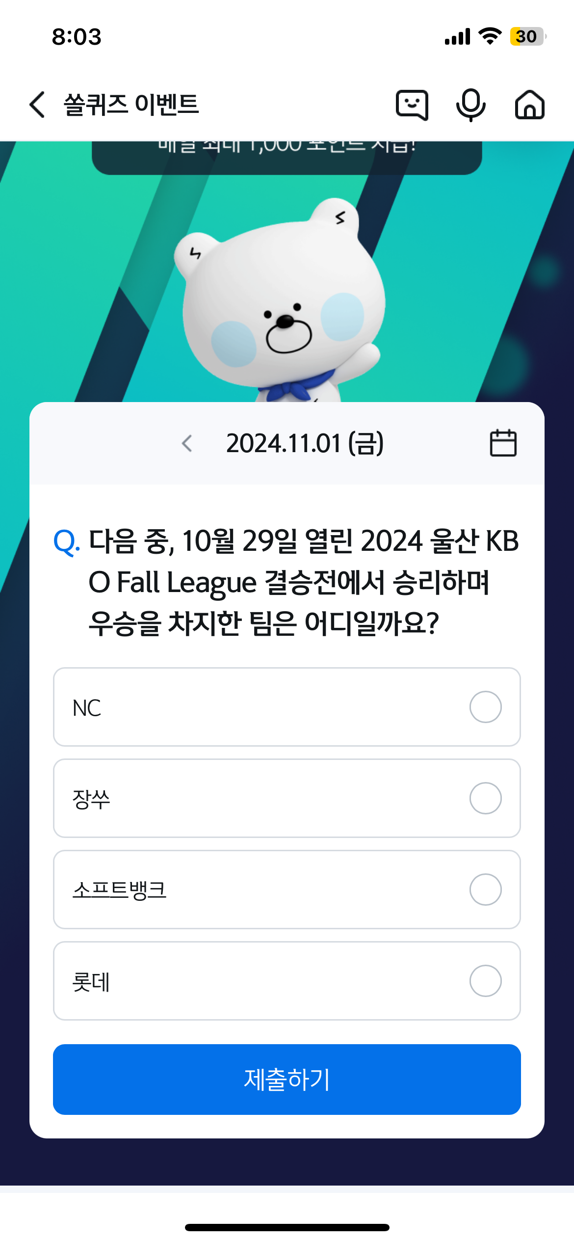 | 2024 한국시리즈 MVP - 신한 쏠퀴즈 2024년11월2일정답 (0) | 2024.11.02 |