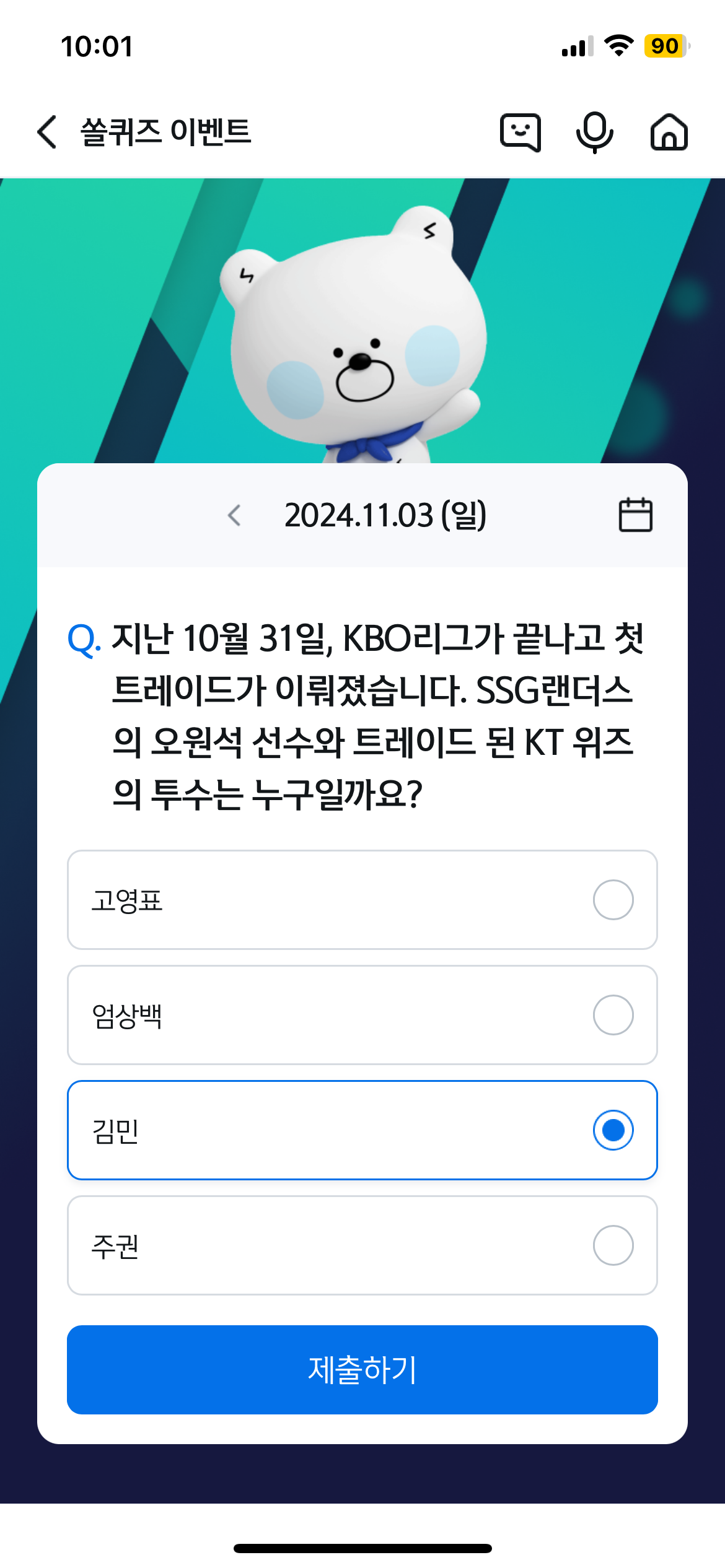 | 2024 한국시리즈 MVP - 신한 쏠퀴즈 2024년11월2일정답 (0) | 2024.11.02 |