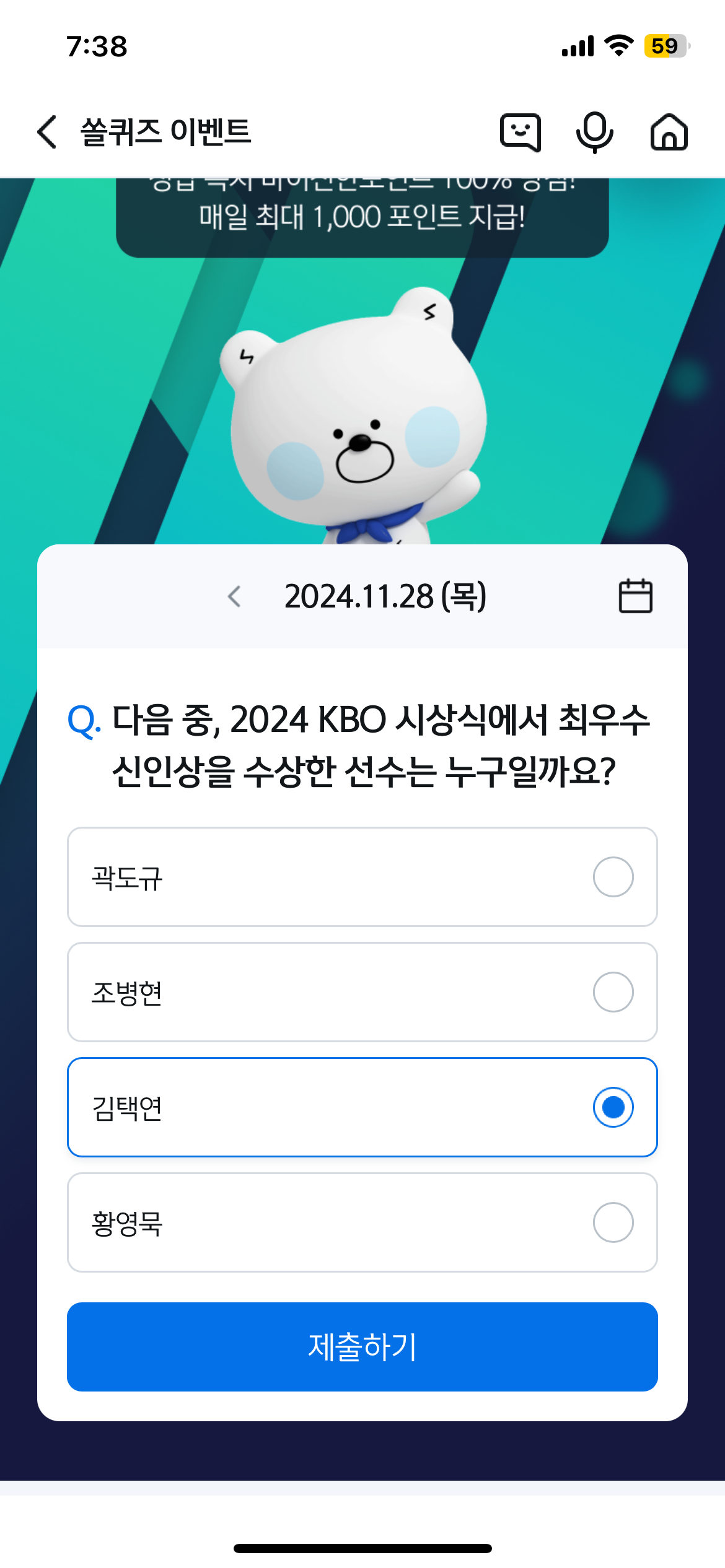 | 2024 KBO MVP - 신한 쏠퀴즈 2024년11월27일정답 (0) | 2024.11.27 |