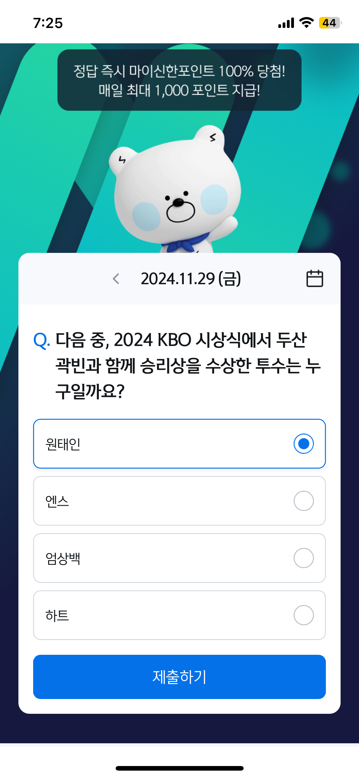 | 2024 KBO MVP - 신한 쏠퀴즈 2024년11월27일정답 (0) | 2024.11.27 |
