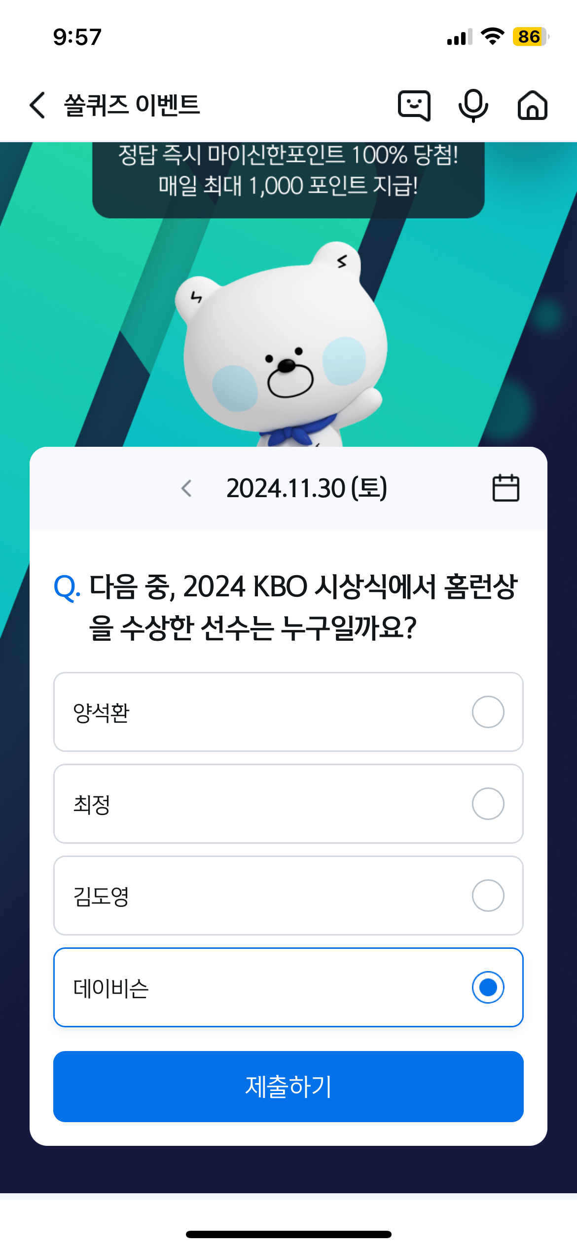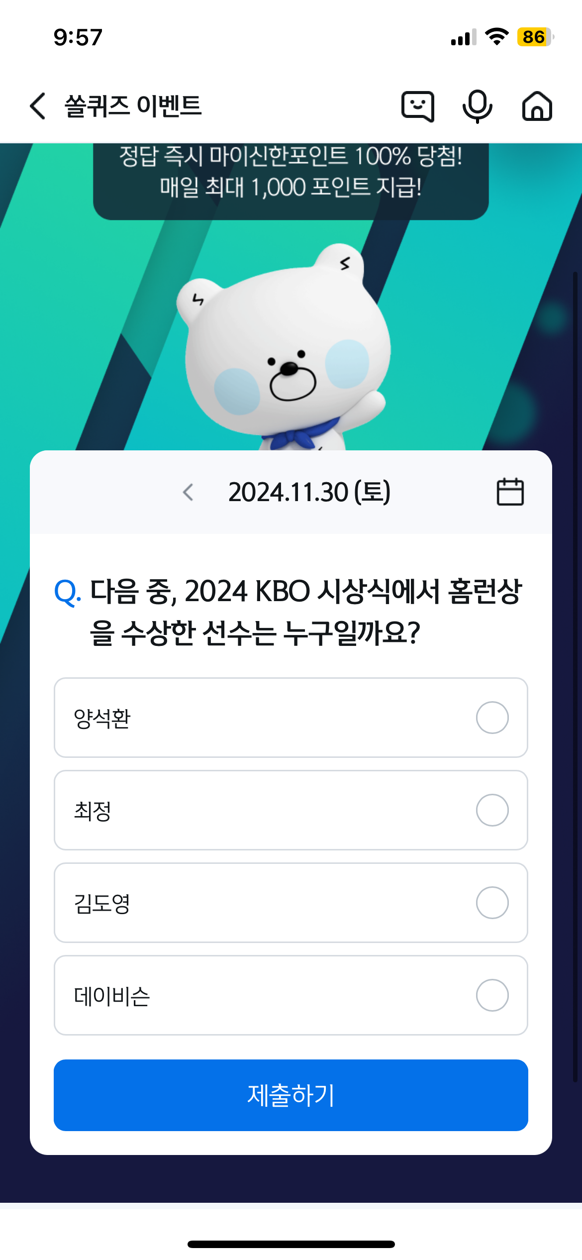 | 2024 kbo 최우수 신인상 - 신한 쏠퀴즈 2024년11월28일정답 (0) | 2024.11.28 |