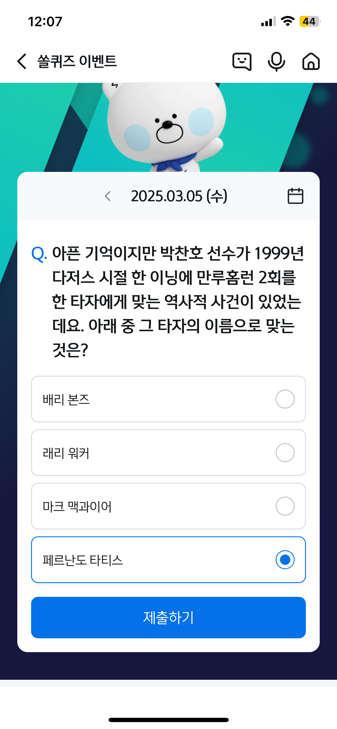 문제: 아픈 기억이지만 박찬호 선수가 1999년 다저스 시절 한 이닝에 만루홈런 2회를 한 타자에게 맞는 역사적 사건이 있었는데요. 아래 중 그 타자의 이름으로 맞는 것은?