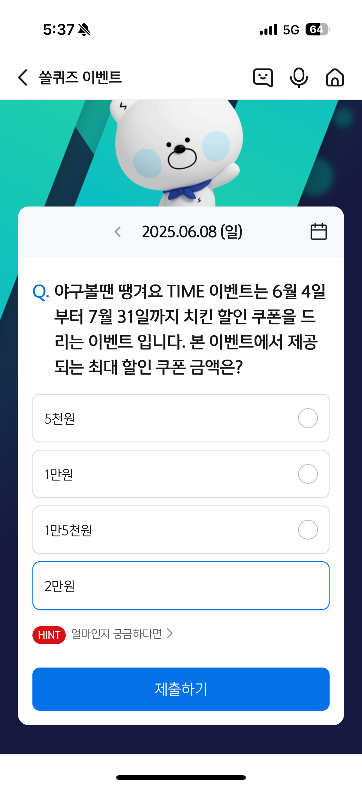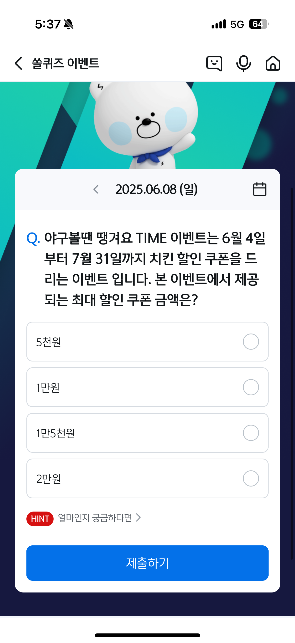 문제: 야구볼땐 땡겨요 TIME 이벤트는 6월 4일부터 7월 31일까지 치킨 할인 쿠폰을 드리는 이벤트입니다. 본 이벤트에서 제공되는 최대 할인 쿠폰 금액은?