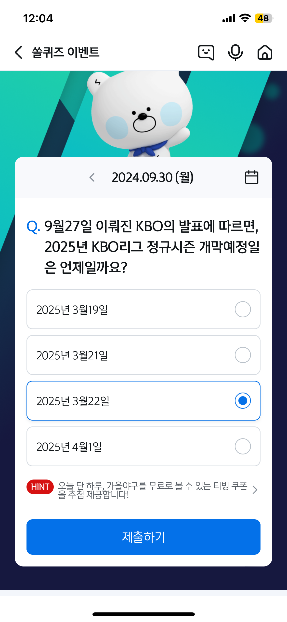 | 2024 KBO리그 정규시즌 마지막경기 날짜 일정 - 2024년9월29일 신한쏠퀴즈 정답 (3) | 2024.09.29 |
