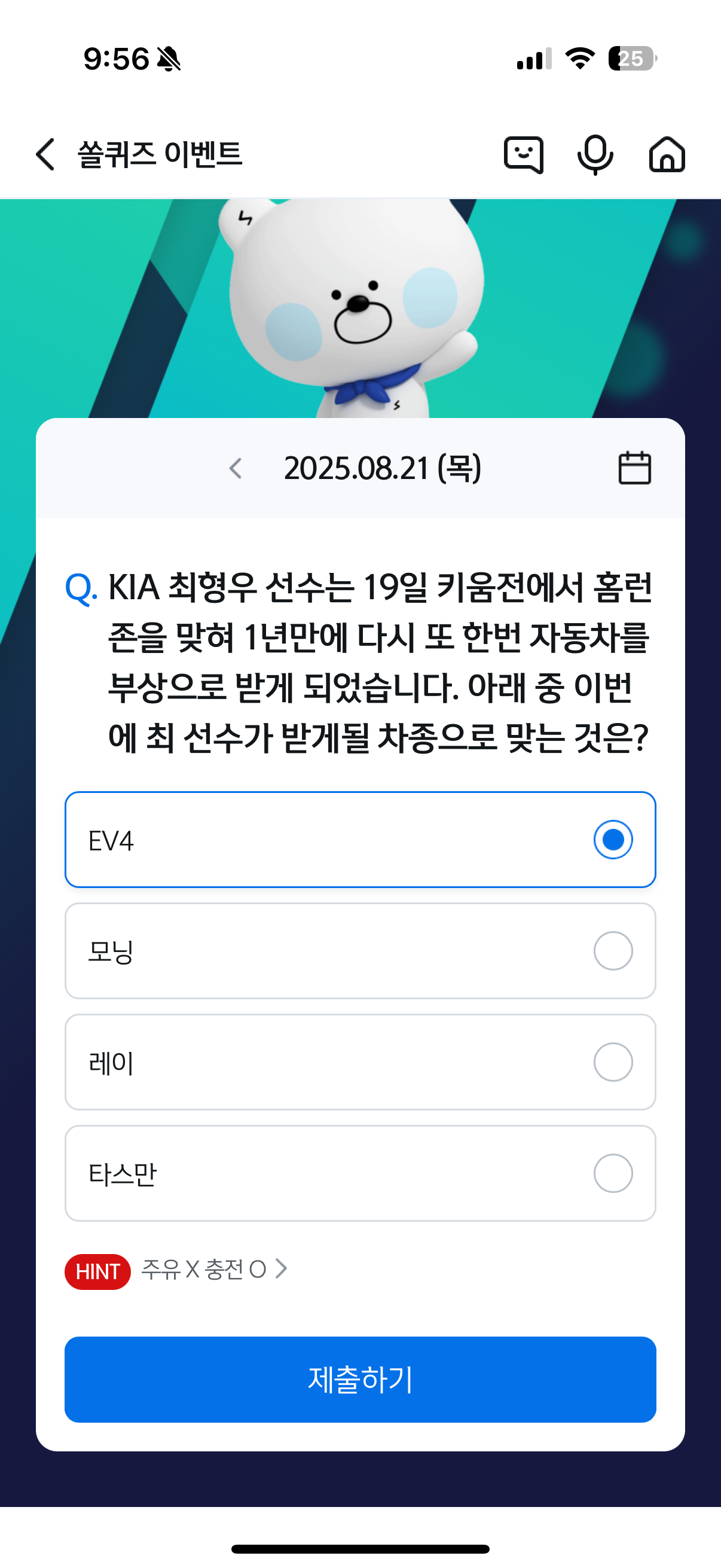 - 2025년 8월 19일 스리런 홈런으로 EV4(약 4천만~5천만 원 상당) 획득