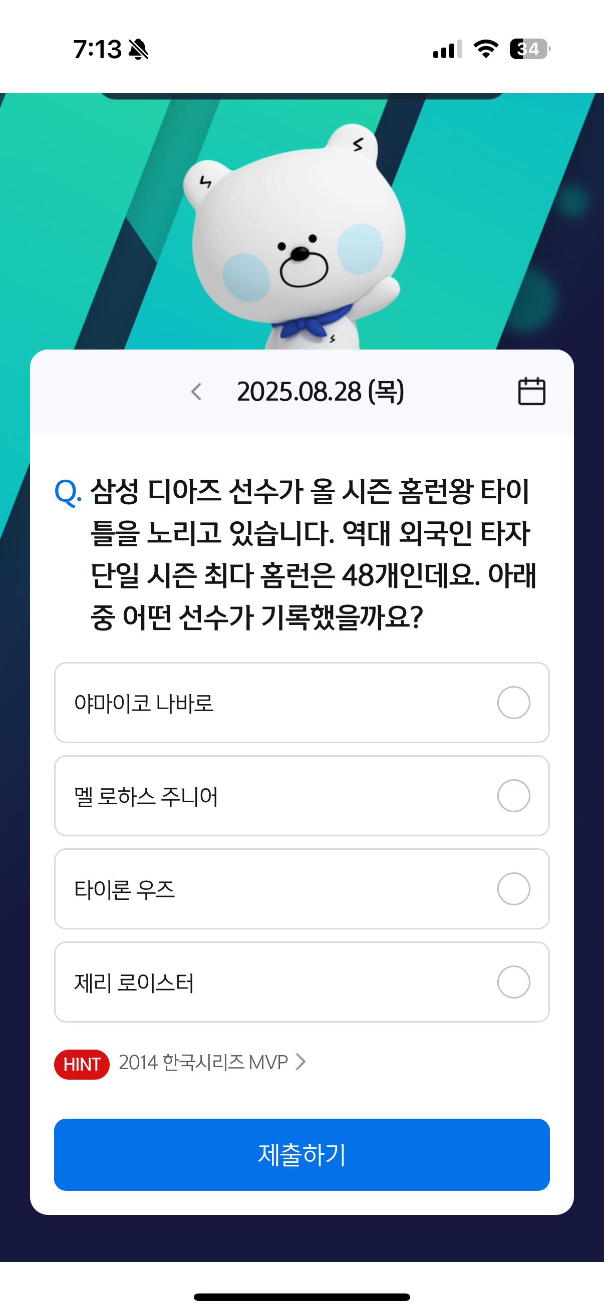 문제: 삼성 디아즈 선수가 올 시즌 홈런왕 타이틀을 노리고 있습니다. 역대 외국인 타자 단일 시즌 최다 홈런은 48개인데요. 아래 중 어떤 선수가 기록했을까요? 2014 한국시리즈 MVP