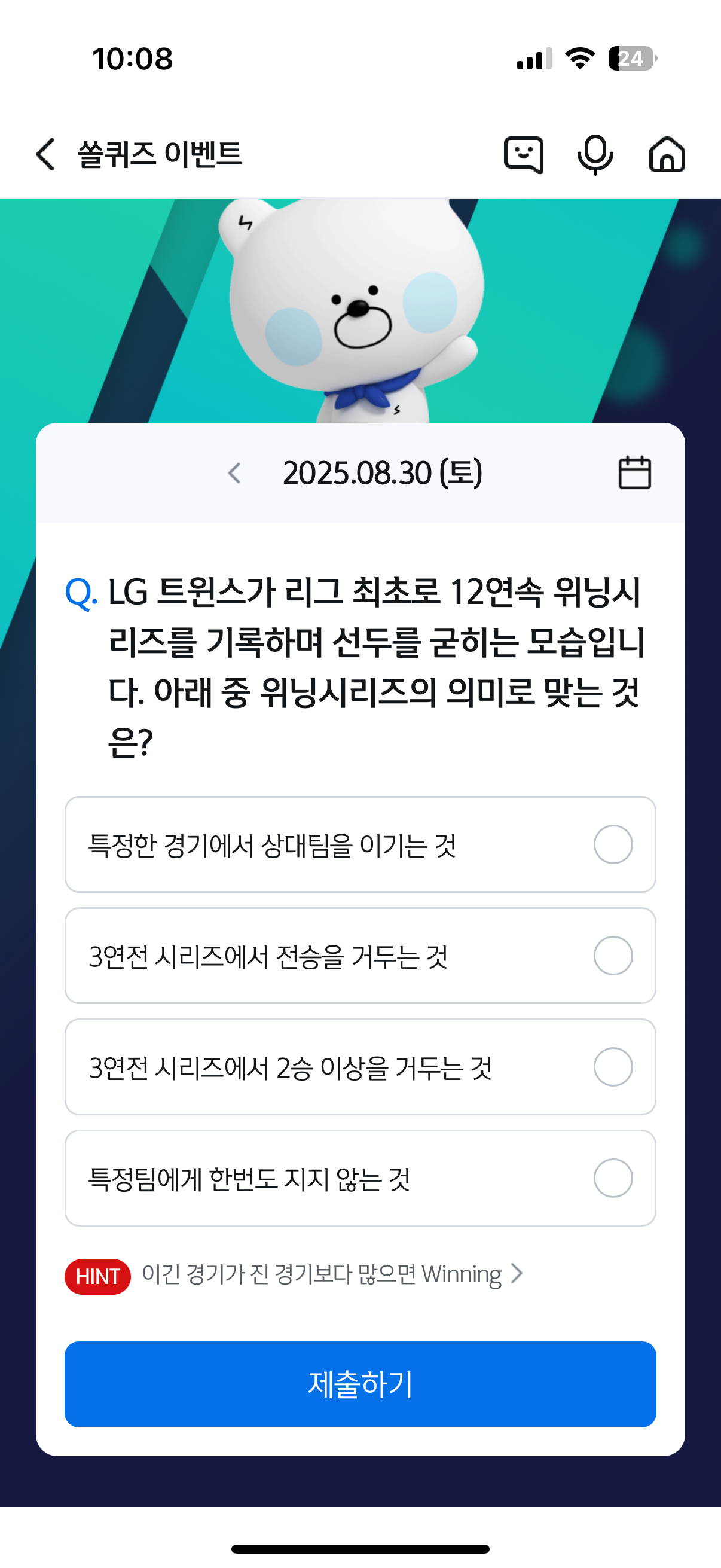 문제: LG트윈스가 리그 최초로 12연속 위닝시리즈를 기록하며 선두를 굳히는 모습입니다. 아래 중 위닝시리즈의 의미로 맞는 것은? 이긴 경기가 진 경기보다 많으면 Winning
