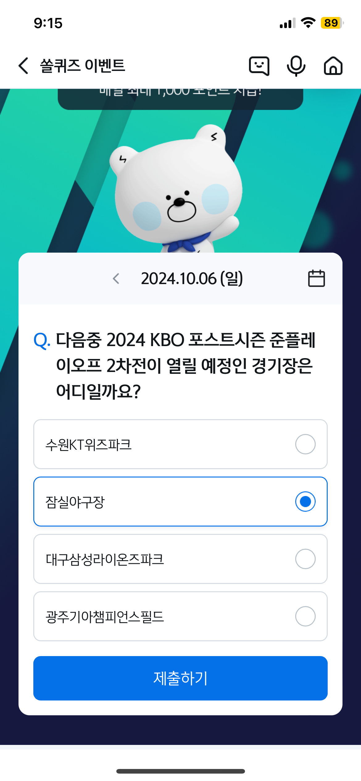 | 2025년 KBO리그 정규시즌 개막예정일 - 2024년9월30일 신한쏠퀴즈 정답 (1) | 2024.09.30 |