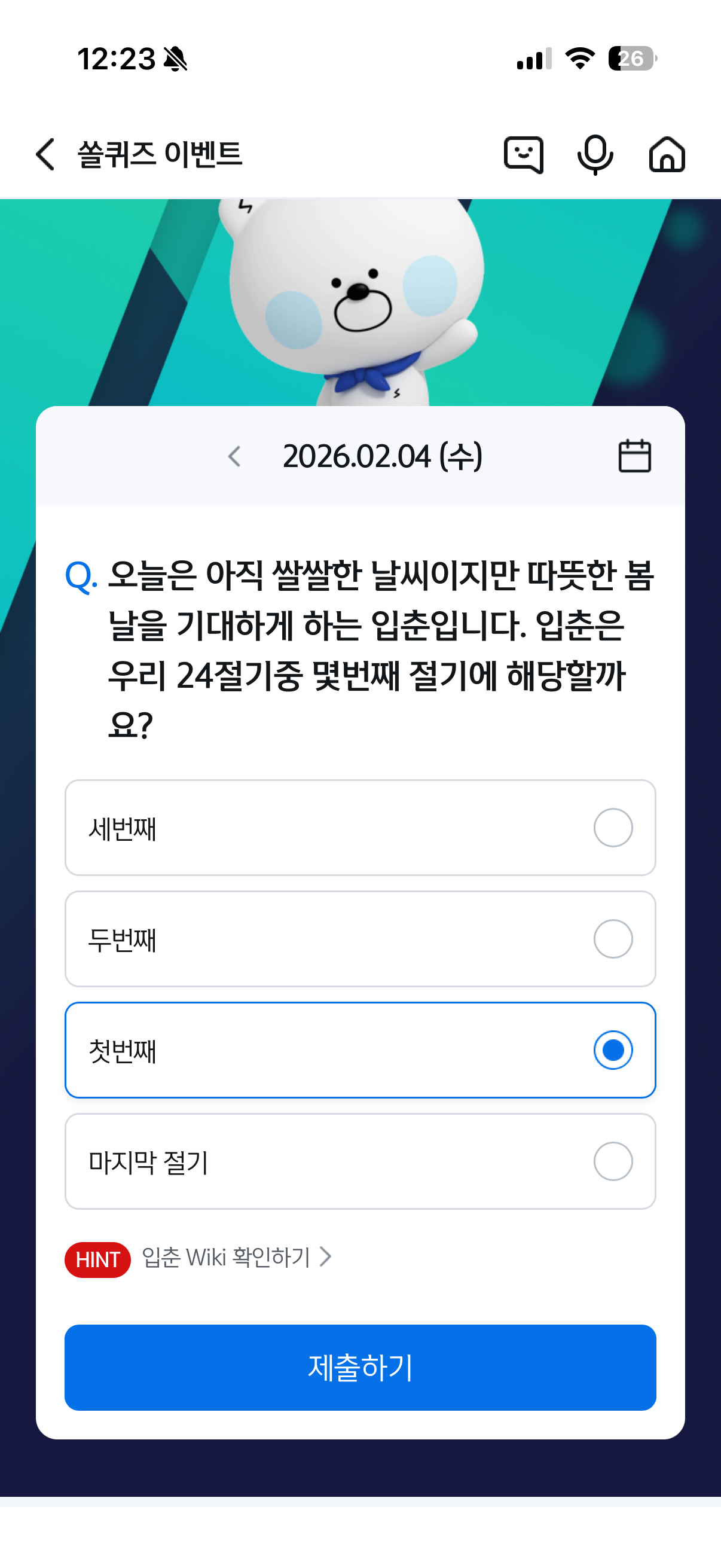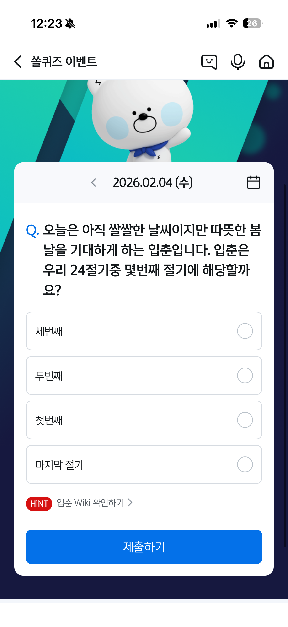 문제: 오늘은 아직 쌀쌀한 날씨이지만 따뜻한 봄날을 기대하게 하는 입춘입니다. 입춘은 우리 24절기 중 몇번째 절기에 해당할까요?