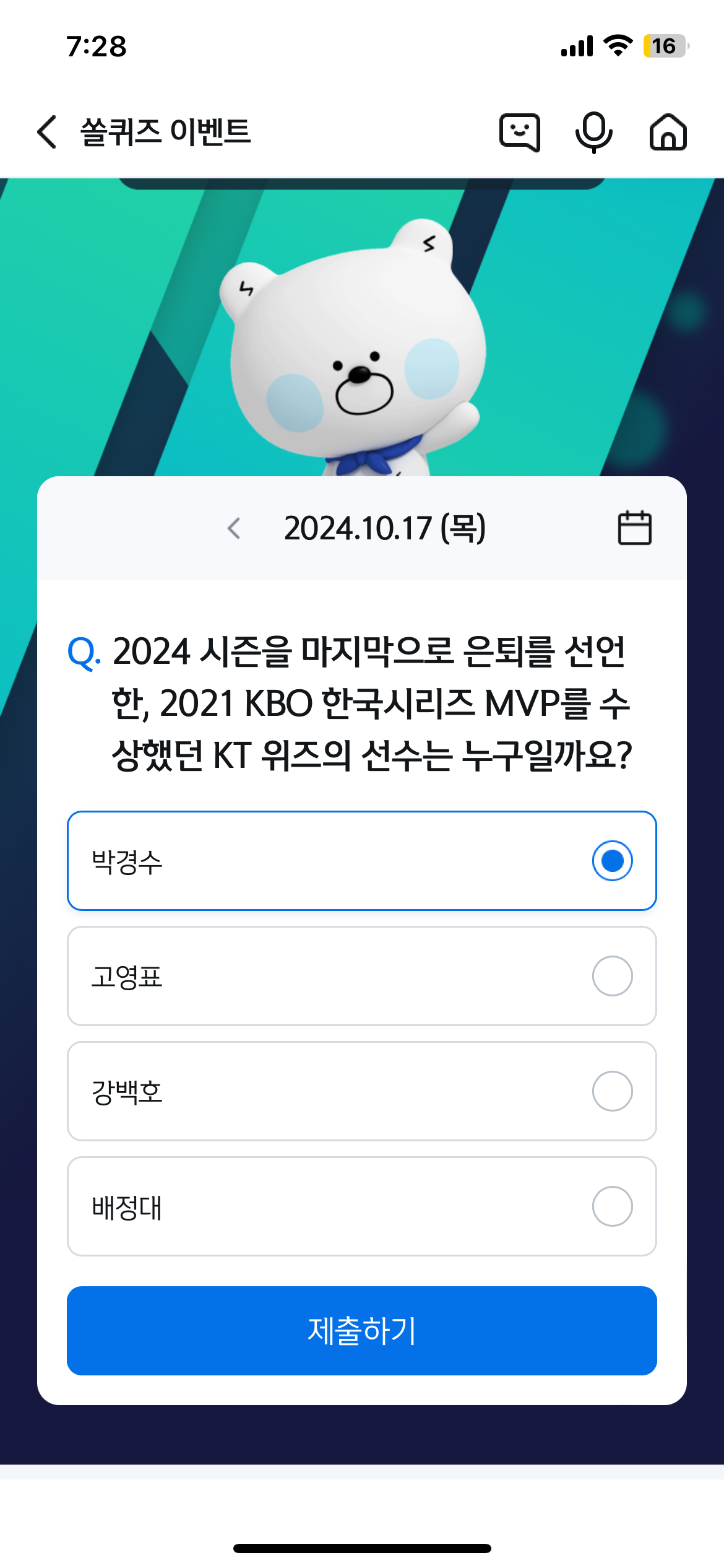 | 준플레이오프 MVP - 신한 쏠퀴즈 2024년10월18일정답 (0) | 2024.10.18 |
